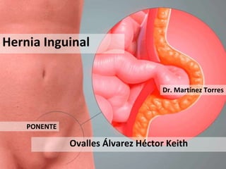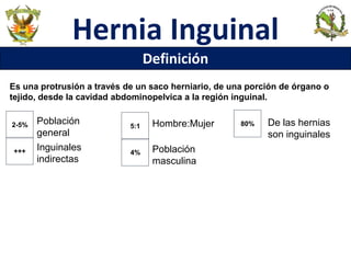 Este documento describe la hernia inguinal, incluyendo su definición, factores de riesgo, clasificación, anatomía, síntomas clínicos, exploración física y técnica quirúrgica de Lichtenstein. La hernia inguinal es una protrusión de tejido u órgano a través del anillo inguinal, y ocurre con más frecuencia en hombres. La exploración física implica invaginar el escroto para identificar la protrusión del saco herniario. La técnica de Lichtenstein utiliza una