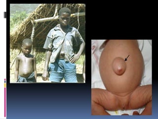 Este documento describe una hernia umbilical, una malformación común de la pared abdominal donde los contenidos abdominales se protruyen a través de un punto débil cerca del ombligo. Generalmente son asintomáticas pero pueden causar una masa visible durante el llanto o esfuerzo físico. La mayoría se cierran espontáneamente a los 3 años sin necesidad de cirugía, aunque en algunos casos raros pueden complicarse con incarceración o estrangulación si no se tratan.