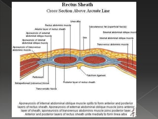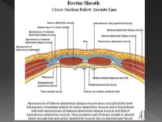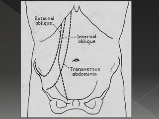 Este documento describe diferentes tipos de hernias abdominales. Define una hernia como la protrusión de estructuras abdominales a través de un orificio en la pared abdominal contenidas en un saco herniario. Describe las hernias umbilicales, inguinales y epigástricas, incluyendo sus factores de riesgo, síntomas, diagnóstico y tratamiento quirúrgico. Las hernias inguinales son las más comunes y se clasifican anatómicamente como directas o indirectas.