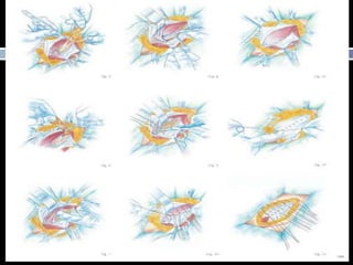Este documento describe los diferentes tipos de hernias de la pared abdominal, incluyendo hernias inguinales, femorales, umbilicales, epigástricas e incisionales. También describe la anatomía relevante y los tipos de tratamiento quirúrgico como las técnicas tisulares de Shouldice, Bassini y McVay, y las técnicas sin tensión como la técnica de Lichtenstein y el tratamiento laparoscópico.
