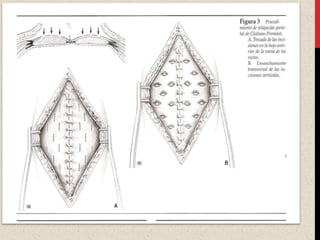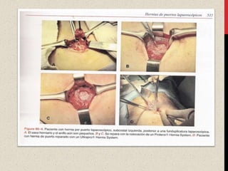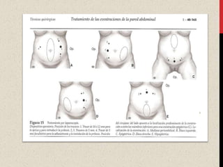 Este documento describe las hernias incisionales, incluyendo su definición, incidencia, etiología, presentación clínica, diagnóstico, clasificación y tratamiento. Las hernias incisionales ocurren cuando se forma un saco peritoneal a través de una debilidad en la pared abdominal causada por una cirugía previa. Su incidencia varía entre el 3-19% y los factores de riesgo incluyen infecciones, obesidad, tabaquismo y cirugías de emergencia. El tratamiento principal es la colocación quirú