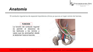 Este documento trata sobre las hernias inguinales. Explica la anatomía del conducto inguinal y cómo es común lugar de hernias. Describe que las hernias inguinales pueden ser directas o indirectas, y las femorales ocurren a través del anillo femoral. El diagnóstico incluye exploración clínica y pruebas de imagen como ecografía o herniografía. El tratamiento puede ser quirúrgico mediante reparación con suturas o mallas a través de cirugía abierta o laparoscopia.