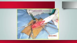 El documento describe la técnica quirúrgica de Eduardo Bassini para el tratamiento de hernias inguinales introducida en 1887. La técnica involucra 1) una incisión oblicua en la zona inguinal, 2) apertura del conducto inguinal, 3) liberación del cordón espermático, 4) apertura y resección del saco herniario, y 5) reconstrucción de la pared posterior del conducto inguinal al suturar el tendón conjunto al arco crural. La técnica de MC Vay también se describe breve