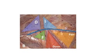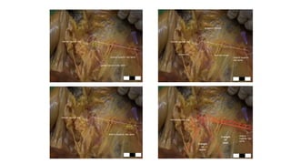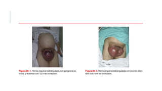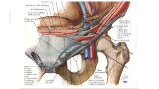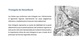 Este documento describe la anatomía de la pared abdominal y las hernias inguinales. En particular, detalla los músculos que componen la pared abdominal, incluidos el recto mayor del abdomen, el piramidal, el oblicuo externo, el oblicuo interno y el transverso del abdomen. También describe la irrigación sanguínea, inervación y funciones de estos músculos. Explica los conceptos de saco herniario, contenido herniario y orificio herniario en relación con las hernias inguinales. Finalmente