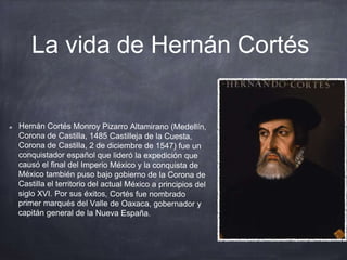 Hernán Cortés dedicó su vida a conquistar el Imperio Azteca en México. Nació en España en 1485 y estudió leyes brevemente antes de embarcarse en aventuras. Llegó a México en 1519 y derrotó al emperador azteca Moctezuma con un pequeño ejército utilizando tácticas inteligentes y alianzas con otros pueblos nativos. Fundó la ciudad de México y gobernó la nueva colonia de Nueva España como su primer virrey. Murió en España en 1547 después de una vida
