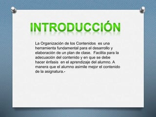 El documento habla sobre la organización de contenidos para la elaboración de un plan de clases. Menciona que organizar bien los contenidos facilita la adaptación del material y enfatizar el aprendizaje de los estudiantes. Luego presenta una lista de contenidos actitudinales, conceptuales y procedimentales a cubrir, incluyendo temas como derechos humanos, geografía, historia y economía.