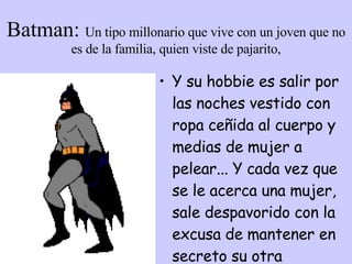 El documento analiza los perfiles psicológicos de varios personajes de dibujos animados populares de la infancia como Batman, Popeye, Pedro Picapiedras, El Increíble Hulk, Shaggy, Superman y Bugs Bunny. Se argumenta que estos personajes exhiben comportamientos como la doble personalidad, las tendencias homosexuales, la drogadicción, la agresividad y la inestabilidad emocional, resultado de haber sido criados principalmente frente a la televisión y expuestos a contenidos inadecuados para su edad.