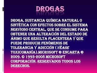Este documento resume los efectos de la heroína, una droga altamente adictiva derivada de la morfina. Explica que la heroína genera una intensa dependencia y tolerancia rápida. Describe los efectos físicos y psicológicos agudos de la heroína, incluida la euforia inicial seguida de sedación, y los síntomas de abstinencia como insomnio, depresión y ansiedad. También advierte que las dosis elevadas pueden causar la muerte por depresión respiratoria.