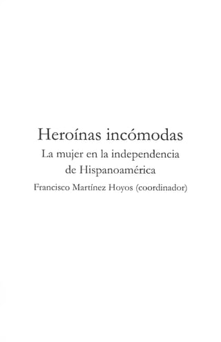 Este documento resume la participación de las mujeres en las guerras de independencia de Hispanoamérica. A pesar de que tradicionalmente se las había excluido de la historia oficial, las mujeres desempeñaron un papel importante en la política y la guerra durante este período, ya sea como espías, propagandistas o combatientes. Si bien inicialmente los líderes independentistas buscaban su apoyo con reticencia y dentro de los roles de género tradicionales, la fuerza de los acontecimientos terminó subvirtiendo las normas sociales y dando