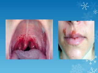 1) Los herpesvirus presentan una morfología similar que consiste en partículas virales envueltas con una cápside icosaédrica y un genoma de ADN de doble cadena. 2) Existen tres subfamilias de herpesvirus: alfaherpesvirus (incluye HSV-1 y HSV-2), betaherpesvirus (incluye CMV) y gammaherpesvirus (incluye EBV y HHV-8). 3) El virus varicela zoster causa la varicela primaria y puede reactivarse años después causando herpes zoster, manifestánd