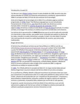La Web 2.0 se refiere a sitios web que facilitan el compartir información y la colaboración entre usuarios para crear contenido. Algunas características clave incluyen permitir a los usuarios interactuar y colaborar como creadores de contenido en lugar de limitarse a la observación pasiva, y el uso de tecnologías como wikis, blogs y redes sociales. Aunque el término sugiere una nueva versión de la World Wide Web, realmente se refiere a cambios en cómo los desarrolladores y usuarios usan la web,