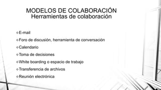 Este documento describe varias herramientas de colaboración como el correo electrónico, foros de discusión, chats, calendarios, herramientas para la toma de decisiones, espacios de trabajo compartidos, transferencia de archivos y reuniones electrónicas. Explica brevemente el propósito y funcionamiento de cada una de estas herramientas.