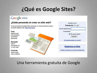 Google Sites es una herramienta gratuita de Google para construir sitios web de forma sencilla y rápida sin necesidad de conocimientos técnicos. Permite crear un número ilimitado de sitios personalizables utilizando plantillas y temas gráficos. El contenido se puede organizar en páginas y secciones y se puede publicar el sitio de forma pública o privada.