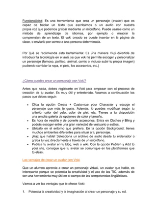 Voki es una herramienta web gratuita que permite crear avatares educativos animados que pueden hablar de acuerdo con indicaciones del usuario. Los usuarios pueden personalizar un personaje virtual seleccionando su apariencia, ropa y accesorios, y grabar o subir un archivo de audio para que el avatar hable. Estos avatares creados con Voki se pueden insertar en páginas web, blogs y wikis para dinamizar la comunicación educativa.