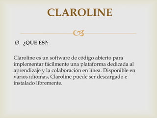 Claroline es un software de código abierto para implementar plataformas de aprendizaje y colaboración en línea de manera fácil. Se puede descargar e instalar gratuitamente en varios idiomas. Para acceder, los usuarios ingresan sus credenciales en la página principal y acceden a una página personalizada con información sobre cursos y configuraciones. Claroline puede actualizarse automáticamente mediante la migración de datos de la versión anterior a la nueva versión de manera compatible.