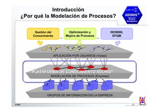 Este documento presenta la herramienta ADONIS® para la gestión integral de procesos. ADONIS® permite modelar procesos de negocio mediante diferentes componentes como modelación, análisis, simulación y documentación. La herramienta ofrece ventajas como facilidad de uso, integración con otros modelos y generación de informes. ADONIS® puede aplicarse para optimizar procesos, gestionar la calidad y el conocimiento, y automatizar procesos.