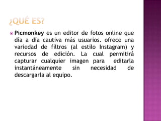 Picmonkey es un editor de fotos en línea gratuito que permite a los usuarios editar e instantáneamente imágenes sin necesidad de descargarlas, ofreciendo una variedad de filtros y herramientas de edición. Aunque algunas funciones avanzadas requieren una membresía de pago mensual o anual, el servicio es compatible con cualquier dispositivo y permite a los usuarios compartir fotos editadas en redes sociales como Facebook.