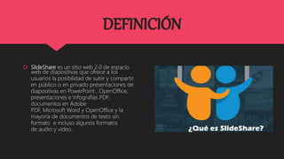 SlideShare es un sitio web que permite a los usuarios subir y compartir presentaciones, documentos PDF, archivos de texto y algunos formatos de audio y video. Ofrece servicios como Zipcasts para transmitir presentaciones en línea con audio/video, Clipping para guardar diapositivas sueltas, y Slidecast para agregar audio a las presentaciones. Subir archivos a SlideShare los hace accesibles desde diversas aplicaciones y permite compartirlos de forma pública o privada.