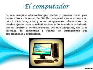 El documento define un computador como una máquina electrónica que recibe datos, los procesa y los convierte en información útil mediante la ejecución precisa y rápida de instrucciones ordenadas y organizadas de acuerdo a lo indicado por un usuario u otro programa.