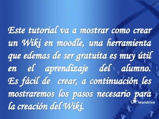 Este tutorial detalla los pasos necesarios para crear un wiki en Moodle, una herramienta gratuita para el aprendizaje. Se explican desde activar la edición hasta guardar los cambios para finalizar la creación. Se incluye la configuración de propiedades y la posibilidad de consultar la guía de ayuda en caso de dudas.