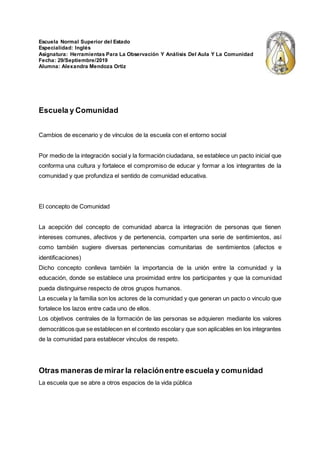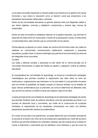 El documento describe la relación entre la escuela y la comunidad. Explica que la escuela y la familia son actores clave de la comunidad y que generan un vínculo que fortalece los lazos entre ellos. También describe cómo se forman redes de alianzas y colaboración entre los miembros de la comunidad educativa para lograr objetivos comunes y abordar problemas. Finalmente, enfatiza la importancia de que las instituciones estatales apoyen la vinculación entre la escuela y la comunidad a través de programas y políticas que fortalezcan la