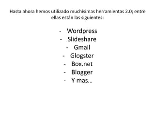 El documento describe varias herramientas 2.0 como Wordpress, Slideshare, Gmail, Glogster y Box.net que facilitan la publicación y compartición de contenido en línea. También menciona A2click, un proyecto educativo, y describe brevemente las funciones de cada herramienta 2.0 discutida como crear blogs, compartir presentaciones, correo electrónico, pósters multimedia y almacenamiento en la nube.
