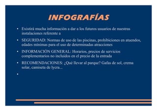 El documento propone varias herramientas para dar vida a la página web de un parque acuático, incluyendo infografías sobre seguridad, horarios y recomendaciones; presentaciones interactivas sobre las atracciones; un calendario con fechas de apertura y eventos; redes sociales para comunicarse con clientes y proveedores; videos de clientes disfrutando del parque; y herramientas de análisis web para mejorar la visibilidad y el contenido del sitio.