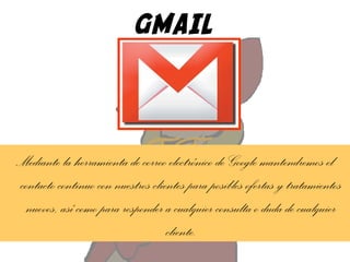 Este documento describe las herramientas de Google (Gmail, Google Calendar, Dropbox) y otras herramientas como WordPress y redes sociales (Facebook, Twitter, Pinterest, Youtube) que se utilizarán para mantener el contacto con los clientes, organizar citas, almacenar archivos de clientes en la nube, crear un blog, difundir contenido y promocionar el negocio.