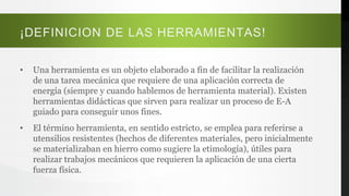 Este documento define las herramientas como objetos elaborados para facilitar tareas mecánicas mediante la aplicación correcta de energía. Explica que las herramientas se diseñan para propósitos específicos y a menudo combinan máquinas simples para proporcionar ventajas mecánicas. Además, clasifica las herramientas en 11 categorías como medida, trazado, sujeción, corte, serrado, rebajado, taladrado, golpeo, atornillar, unión y construcción.