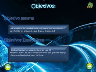 Un live CD es un sistema operativo que se almacena en un CD booteable, permitiendo ejecutar el sistema sin necesidad de instalación. Los live CD tienen varios usos como probar un sistema sin instalarlo, detectar hardware, e instalar software adicional. Las distribuciones de Linux incluyen varios live CD como Knoppix, Debian y Arch Linux.