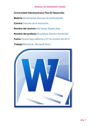 Este manual de Microsoft Word describe las diferentes pestañas y herramientas disponibles en el programa. Explica funciones como crear, abrir y guardar documentos, formato de texto, inserción de tablas e imágenes, revisión ortográfica, y más. El manual contiene instrucciones paso a paso para utilizar las diversas opciones de Word.