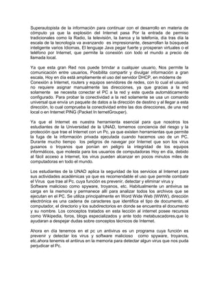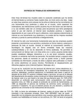 El documento describe la evolución del internet desde sus inicios hasta la actualidad. Comenzó como una idea y con el tiempo se convirtió en una poderosa herramienta utilizada a nivel mundial, permitiendo la comunicación masiva y el acceso al conocimiento. El internet ha evolucionado con servicios como correo electrónico, mensajería instantánea y el World Wide Web, y hoy en día es una herramienta fundamental tanto para empresas como para estudiantes.
