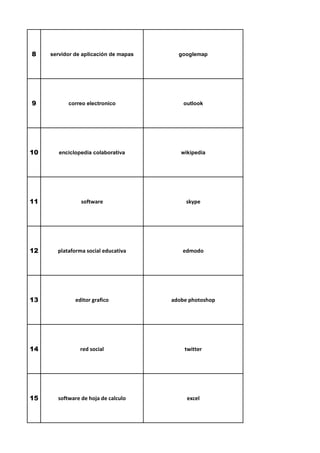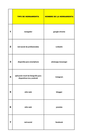 El documento proporciona una lista detallada de diversas herramientas y plataformas digitales, clasificadas según su tipo y función, como navegadores, redes sociales, aplicaciones de mensajería, software educativo y de productividad. Cada herramienta se describe brevemente junto con su URL, destacando sus beneficios en la comunicación, la educación, la gestión de proyectos y el entretenimiento. Además, se mencionan ventajas personales y laborales al utilizar estas herramientas en la vida diaria.