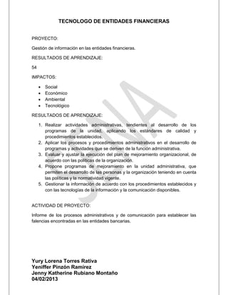 El documento describe el proyecto de un tecnólogo de entidades financieras. El proyecto evalúa los procesos administrativos y de comunicación en entidades bancarias para identificar áreas de mejora. El proyecto incluye las fases de propuesta, análisis y ejecución, y control y evaluación. Además, presenta la misión, visión y objetivos del Servicio Nacional de Aprendizaje (SENA) de Colombia.