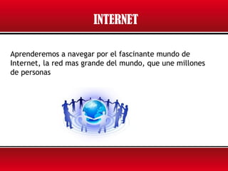 Este documento ofrece una introducción a Internet, explicando que es una red mundial de computadoras que conecta millones de personas. Explica conceptos clave como navegadores, páginas web, URLs, dominios y buscadores, que permiten a los usuarios navegar e intercambiar información en este gran océano de datos. También incluye un breve resumen de la historia de Internet y cómo ha evolucionado para llegar a los usuarios individuales de hoy en día.
