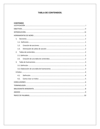 El documento aborda el uso de herramientas de Microsoft Word, destacando secciones, tablas de contenido, tablas de ilustraciones e índices. Se detalla cómo crear y gestionar estas herramientas para mejorar la presentación de documentos, subrayando su importancia en la elaboración de trabajos académicos. Además, se concluye que el dominio de estas aplicaciones potencia la calidad y organización de los proyectos realizados en Word.