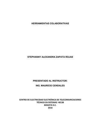 Este documento describe varias herramientas colaborativas como Google Docs, que permite crear y editar documentos en línea de forma colaborativa; Sumo Paint, un programa de dibujo en capas; Mind Meister, un software de mapas mentales; Wikipedia, la enciclopedia colaborativa; Project Draw, un editor de gráficos vectoriales; y SourceForge, una plataforma para compartir proyectos de software de código abierto.