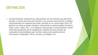 Las herramientas colaborativas permiten a los usuarios comunicarse y trabajar juntos sin importar su ubicación física, compartiendo información como audio, texto y video. Funcionan bajo el modelo de cliente-servidor, donde los clientes son los usuarios y el servidor ofrece el servicio al que acceden los clientes a través de programas como un navegador web. Los servidores almacenan y coordinan el flujo de información, mientras que los clientes permiten a los usuarios acceder a los servicios y publicar o ver información de otros. Un