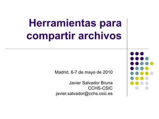 El documento describe varias herramientas para compartir archivos en línea como fotografías (Panoramio, Flickr), videos (YouTube, Vimeo), presentaciones (SlideShare, MyPlick) y otros archivos (Google Docs, Zoho). Muchas son gratuitas pero con límites y requieren registro e identificación. Permiten etiquetar, geolocalizar y compartir contenidos con redes sociales. Algunas como YouTube e integran contenidos en buscadores como Google.