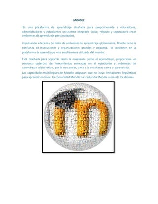 El documento describe varias herramientas de aprendizaje virtual como Moodle, Edmodo, Claroline, Blackboard, Coursera y Dokeos. Moodle es una plataforma de aprendizaje diseñada para crear ambientes de aprendizaje personalizados e integrados. Edmodo es una plataforma educativa social gratuita para la comunicación entre estudiantes y profesores. Claroline permite crear espacios de cursos libres y ofrece herramientas flexibles. Blackboard y Coursera también son plataformas educativas virtuales. El documento m