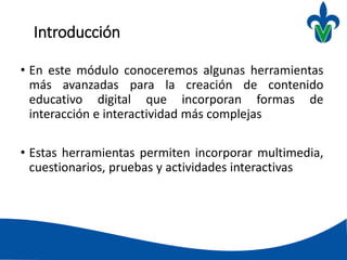 Este documento presenta algunas herramientas avanzadas para crear contenido educativo digital interactivo, como CourseLab, eXe Learning, LIM, Constructor y Hot Potatoes. Explica que la interacción es la relación entre personas en tiempo real o diferido, mientras que la interactividad es la relación entre personas y sistemas. También describe que las herramientas de autor permiten crear y publicar unidades didácticas en formato web incorporando multimedia, cuestionarios y actividades interactivas.
