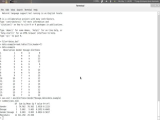 Este documento presenta información sobre el lenguaje de programación R y su uso para análisis estadístico y de datos. También describe un experimento factorial con datos sobre género, dosis y atención. Los resultados del análisis de varianza muestran que el género puede ser un factor determinante pero no la dosis o su interacción. Se incluye una bibliografía con un enlace a más información sobre R.