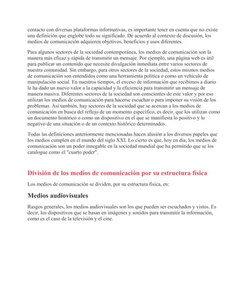 Este documento define los medios de comunicación y describe sus diferentes tipos. Define los medios de comunicación como instrumentos utilizados para informar y comunicar de manera masiva. Describe los medios de comunicación como periódicos, radio, televisión y páginas web. Divide los medios de comunicación en categorías como audiovisuales, radiofónicos, impresos y digitales. Explica que cada medio tiene características diferentes pero todos sirven para transmitir información a grandes audiencias.