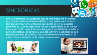 Este documento describe diferentes herramientas de comunicación sincrónicas y asincrónicas. Las herramientas sincrónicas como el chat y la videoconferencia permiten la comunicación en tiempo real, mientras que las asincrónicas como el correo electrónico y los foros no requieren que los usuarios estén conectados al mismo tiempo. También se mencionan otras herramientas como la mensajería instantánea, los blogs y los portafolios electrónicos.