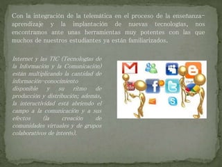 La comunicación efectiva requiere herramientas eficientes, especialmente considerando que la comunicación es fundamental en los procesos de enseñanza y aprendizaje. Las nuevas tecnologías como Internet y las TIC están ampliando la cantidad de información disponible y cómo se distribuye de manera interactiva, creando comunidades virtuales. Existen diferentes tipos de software educativo como cursos en línea, software de referencia y juegos educativos, que facilitan el aprendizaje y la enseñanza de manera creativa.
