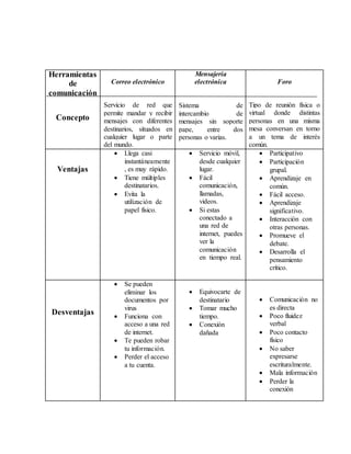 El documento describe tres herramientas de comunicación electrónica: correo electrónico, mensajería electrónica y foros virtuales. Define cada una y enumera sus ventajas como la rapidez, accesibilidad y capacidad de interactuar con múltiples personas; y sus desventajas como problemas de conexión, seguridad y habilidades de expresión escrita. El documento fue preparado por un docente en formación y un docente asesor de la Escuela Normal Superior Distrital de Barranquilla, Colombia.
