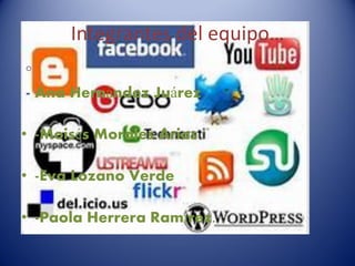 Este documento presenta una lista de herramientas de comunicación populares como Facebook, YouTube, Twitter, WhatsApp e Instagram. Luego proporciona breves descripciones de cada plataforma, destacando que permiten compartir contenido como videos, fotos y mensajes. También incluye detalles sobre wikipedia, Google, Yahoo, videoconferencia y otras herramientas.