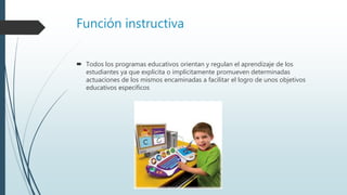 El documento describe las diferentes funciones que cumplen los programas educativos: proporcionar información estructurada a los estudiantes, orientar y regular el aprendizaje para lograr objetivos educativos, motivar e interesar a los estudiantes, evaluar el trabajo de los estudiantes, permitir investigaciones, expresar conocimientos, enseñar lenguajes informáticos, ofrecer un aspecto lúdico y ser innovadores al utilizar tecnología reciente.