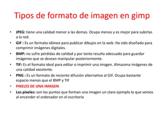 Este documento resume los diferentes formatos de imagen en GIMP, incluyendo JPEG para subir a la web, GIF para dibujos web, BMP para edición, TIF para impresión, y PNG como alternativa a GIF. También describe las herramientas de selección como varita mágica, degradado y emborronado, y explica que las imágenes vectoriales usan entidades geométricas mientras los mapas de bits usan píxeles. Finalmente, resalta que las capas en GIMP permiten componer múltiples imágenes y aplicar
