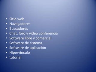 El documento describe varias herramientas de internet, incluyendo sitios web, navegadores, buscadores, chat, foros, videoconferencia, software libre y comercial, software de sistema, software de aplicación, hipervínculos y tutoriales. Explica brevemente qué son cada una de estas herramientas y cómo funcionan.